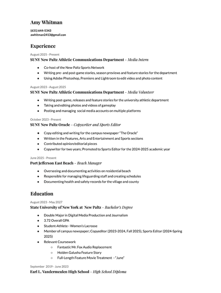 My name is Amy Whitman, an aspiring journalist and student at the State University of New York at New Paltz, pursuing a dual degree in Digital Media Production and Journalism. I am a member of the on-campus newspaper The Oracle and am a student-athlete at SUNY New Paltz, playing women's lacrosse. Due to my consistent participation in sports throughout my life, I am proficient in sports writing and photography, which makes up the majority of my portfolio. However, I am also interested in feature and entertainment journalism and have skills in writing, copyediting, photography and videography. I have completed an internship at the SUNY New Paltz Athletic Communications Department after volunteering there for two years. I intend to pursue another external internship in multimedia and journalism in 2026.